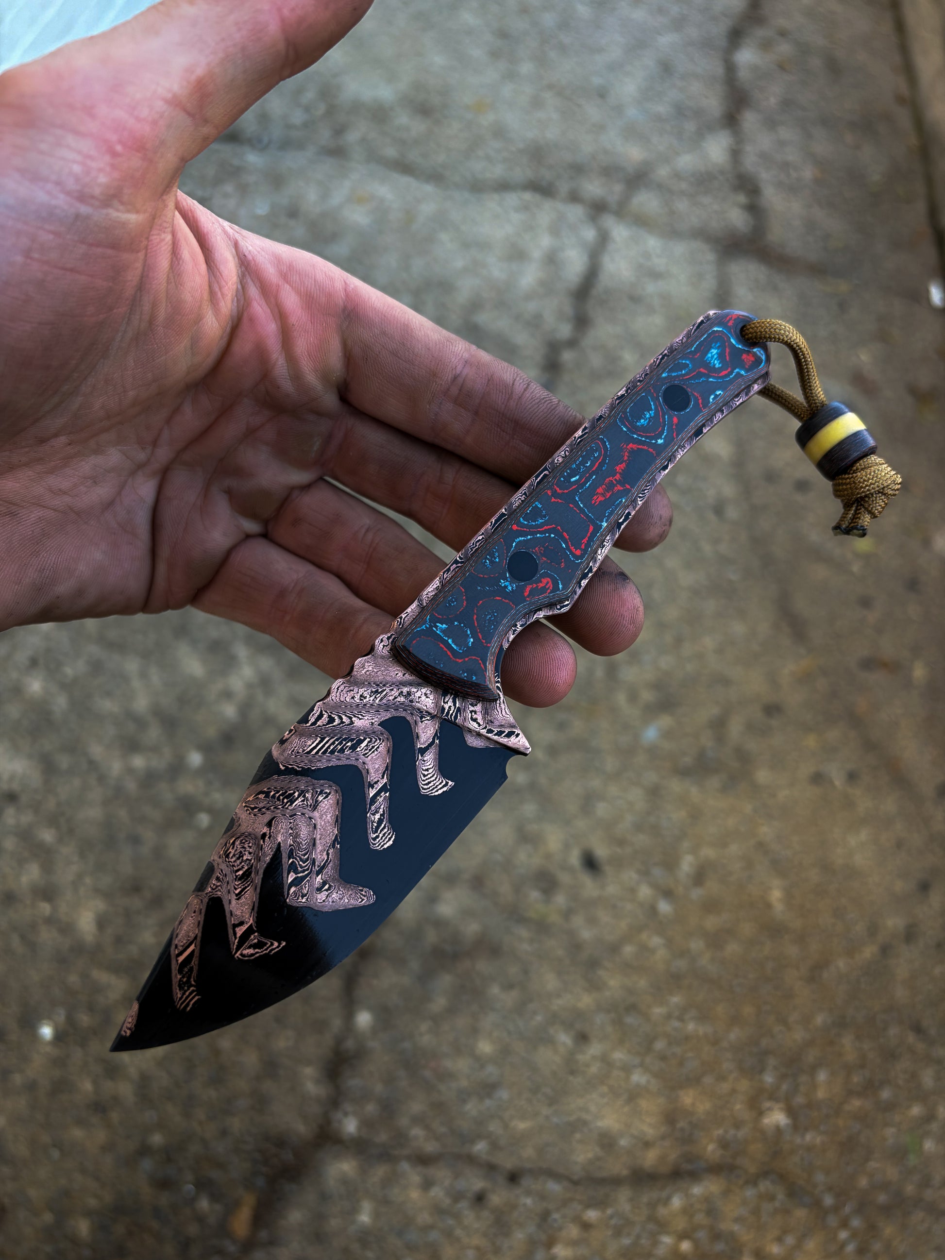 This is one of the fanciest knives I’ve ever made. My Cryptid design with Baker forge CopperMai Damascus, and inset Camo Carbon scales and black micarta hardware. Comes with a matching lanyard bead.