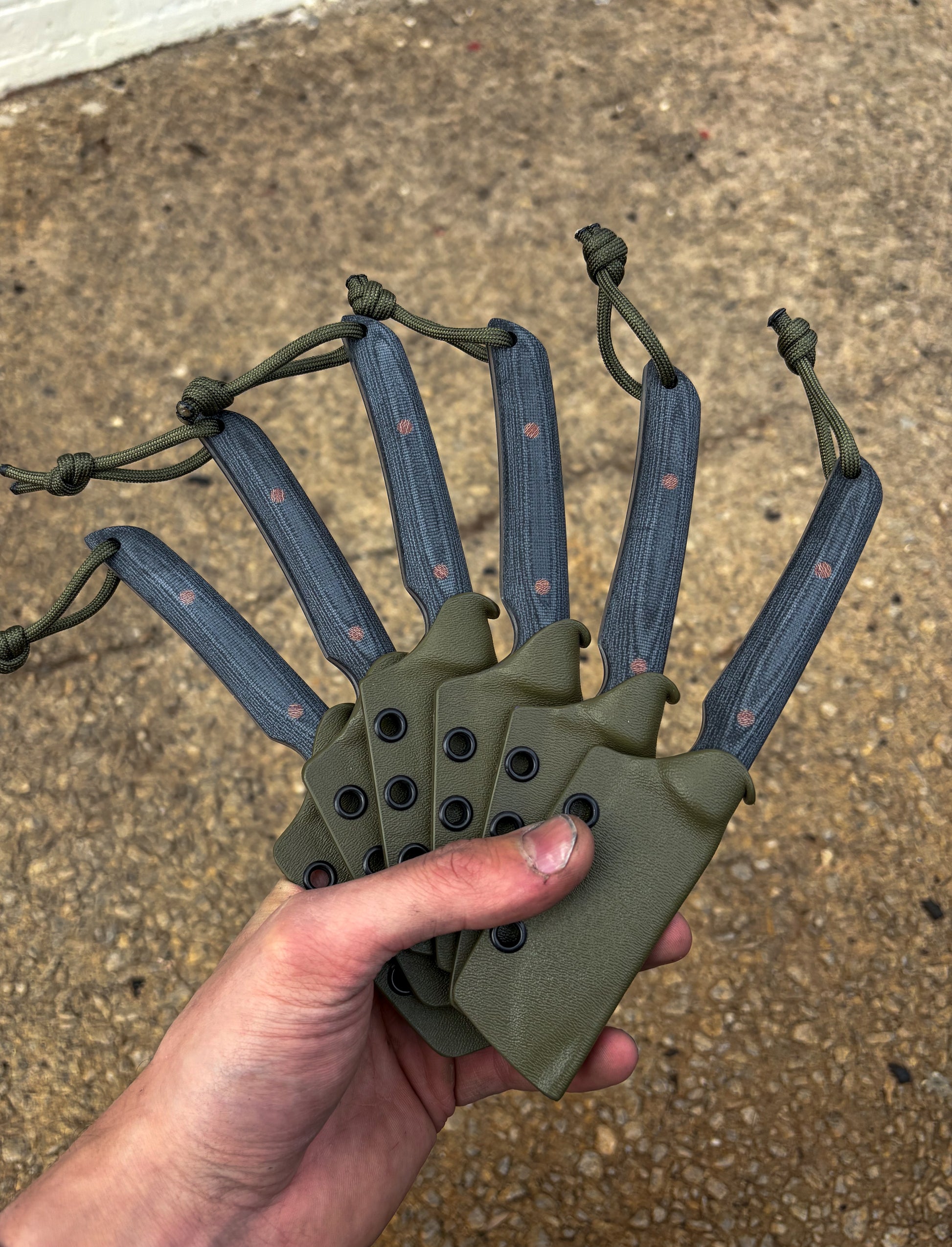 These Daggers are in CPM-Magnacut at 64/65 HRC and feature a saber grind and jimping on the spine. They have black canvas micarta with a rough finish, and brown micarta pins. They come with an OD green kydex sheath. No frills and ready for the field!